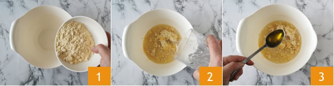 Para realizar las crepes de garbanzos con mousse de bacalao, empezad por la preparación de la masa. Pon la harina de garbanzos en un bol 1, añade el agua 2, luego una pizca de sal y una cucharada de aceite de oliva virgen extra 3.