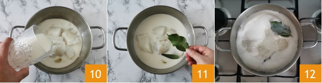 Vierte la leche 10, la salvia, el laurel 11 y cuece a fuego medio durante 5 minutos 12.