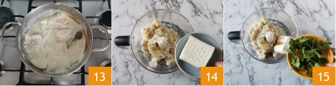 Apaga y deja enfriar 13. Escurre el bacalao frío de la cacerola y colócalo en un procesador de alimentos. Añade la crescenza 14, una pizca de sal, una cucharadita de pimienta y una de nuez moscada. Aromatiza con el perejil 15 y tritura durante unos minutos.