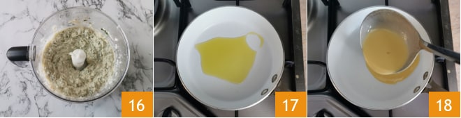 Debes obtener una espuma suave 16. Ahora cuece las crepes: en una sartén de unos 14 cm de diámetro calienta un poco de aceite de oliva virgen extra 17, luego elimina el exceso con un trozo de papel absorbente de cocina. Retoma la mezcla de las crepes, mezcla con la varilla y vierte un cucharón de mezcla en el centro de la sartén caliente 18. Gira la sartén de modo que la mezcla cubra toda la superficie de manera uniforme.