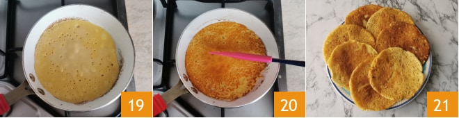 Cuécela durante 1-2 minutos 19 luego da la vuelta a la crepe con una espátula. Cocina también el otro lado 20. A medida que vayas cocinando las crepes, colócalas en un plato 21.