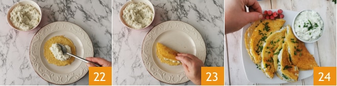 Una vez frías, rellena las crepes con 1-2 cucharadas de mousse de bacalao 22 y ciérralas en forma de libro 23. Sazónalas con cebollino picado y luego sirve tus crepes de garbanzos con mousse de bacalao 24.