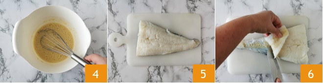 Mezcla con una varilla manual y deja reposar durante una hora 4. Pasa a la preparación de la mousse de bacalao. Coloca el filete de bacalao ya remojado sobre una tabla de cortar 5, haz una pequeña incisión en el extremo de la cola y con un cuchillo de cocina afilado separa la carne de la piel para quitar esta última 6. Pasa la hoja del cuchillo a ras con la tabla sujetando con la otra mano la parte de la cola, de modo que la hoja deslice mejor.