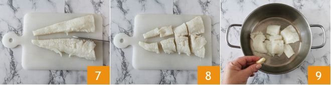 Ahora corta el filete en dos partes a lo largo 7 y luego en trozos pequeños 8. Pon el bacalao en una cacerola junto con el diente de ajo 9.