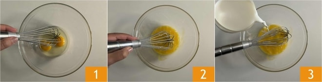 Para preparar las crepes sin mantequilla, verted los huevos enteros en un bol 1 y batidlos con el batidor 2. Verted la leche en hilo 3.