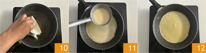 Eliminad con papel de cocina el aceite sobrante 10. Verted un cucharón de masa 11 hasta cubrir el fondo 12.