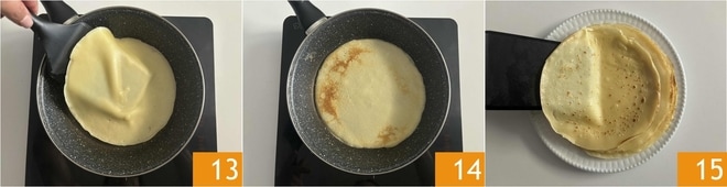 Después de aproximadamente un minuto, manteniendo el fuego medio, notaréis que los bordes comenzarán a despegarse de la sartén y estarán ligeramente dorados, dadle la vuelta a la crepe con una espátula 13 y cocinadla también por el lado opuesto 14. Transferid la crepe a un plato, apilándolas una encima de otra (15). Las crepes sin mantequilla están listas, podréis elegir si servirlas en versión dulce o salada.