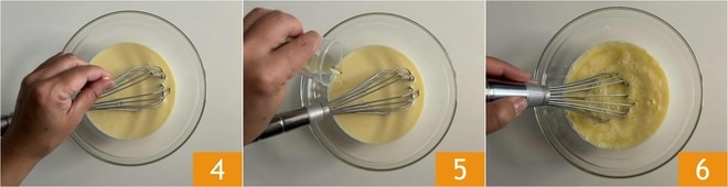 Añadid una pizca de sal 4 y el aceite de oliva virgen extra 5, mezclando siempre con el batidor 6.