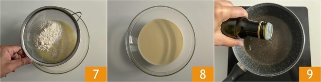 Ahora incorporad la harina tamizada a través de un colador, poco a poco 7, mezclando siempre con el batidor, así se evita la formación de grumos y se obtiene una masa lisa y homogénea 8. Verted un hilo de aceite en una sartén de diámetro de 18 cm 9.