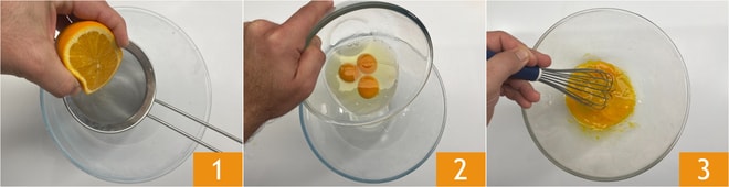Para preparar las crepes sin leche, lo primero que hay que hacer es exprimir las naranjas, colar el jugo con un colador 1 y reservar. En un bol, cascar los huevos 2 y batirlos con un batidor manual 3.