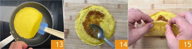 Cocinar durante aproximadamente un minuto, hasta que se dore, y luego, con la ayuda de una espátula, darle la vuelta a la crepe 13 y cocinar durante 1 minuto más. Una vez cocida, colocarla en un plato y repetir los mismos pasos hasta terminar toda la masa. Se pueden condimentar las crepes poniendo una cucharada de mermelada en el centro 14 y luego doblarlas en forma de media luna 15.