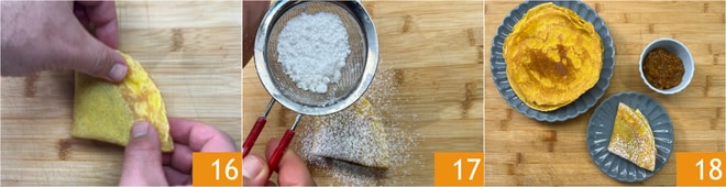 Dóblalas nuevamente a la mitad para formar un triángulo 16 y espolvorea con azúcar glas 17. ¡Tu crepe sin leche está lista para disfrutar 18!