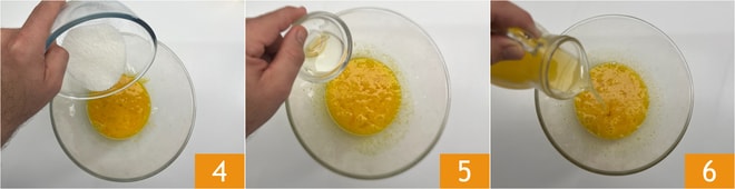 Añadir el azúcar e incorporarlo a los huevos 4. Agregar el aceite de girasol 5, el jugo de naranja 6 y mezclar.
