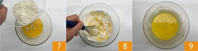 Incorporar la harina 7 y mezclar enérgicamente 8 hasta obtener una masa lisa y sin grumos 9.