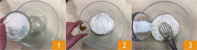 Para preparar las crepes sin huevos, lo primero que hay que hacer es derretir la mantequilla en un cazo y reservar. En un bol, vierta la harina 1, la canela 2 y una pizca de sal, luego mezcle rápidamente. Añada la leche mientras sigue mezclando 3, de esta manera evitará la formación de grumos.