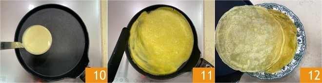 Vierta en el centro un cucharón de masa 10 y, girando la sartén, distribúyala por toda la superficie. Cocine a fuego medio durante aproximadamente un minuto. Cuando la crepe comience a despegarse de los bordes, puede darle la vuelta 11 y cocinar el otro lado durante un minuto más, hasta que esté dorada. Proceda de esta manera hasta terminar la masa. A medida que cocine las crepes, apílelas en un plato 12.
