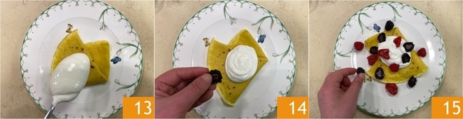 Doble las crepes a la mitad dos veces para formar triángulos y adórnelas con la crema de yogur 13. Finalmente, complete con frambuesas, moras 14 y algunas hojitas de menta. ¡Tus crepes sin huevos están listas para ser servidas 15!
