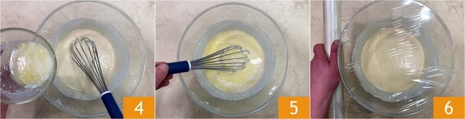 Agregue también la mantequilla derretida y tibia 4 y mezcle de nuevo para incorporar todo 5. Cubra con film transparente 6 y deje reposar en la nevera durante 30 minutos.