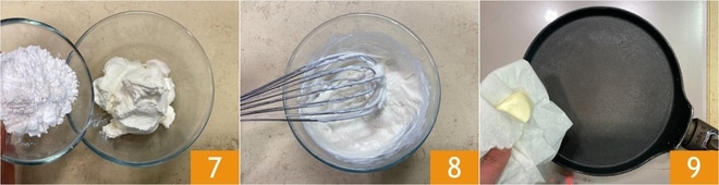 Mientras tanto, prepare el relleno: coloque el yogur en un bol, añada el azúcar glas 7 y mezcle hasta obtener una mezcla cremosa y homogénea 8. Unte con un poco de mantequilla una crepera de 24 cm de diámetro (o una sartén antiadherente de las mismas dimensiones).