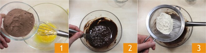 Para realizar las crepes con crema de Nesquik, comienza con la preparación de la crema que servirá para el relleno: bate en un bol las yemas y añade Nesquik 1, mezcla para amalgamar los ingredientes y obtener una mezcla homogénea 2 luego añade la harina tamizada 3 y