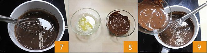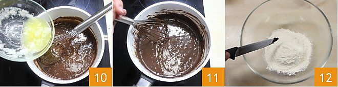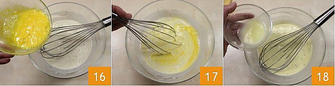 y añádelo a la mezcla de leche y harina 16 continúa mezclando 17 con el batidor hasta obtener una mezcla clara. Funde en el microondas la mantequilla y añádela incorporándola a la mezcla 18.