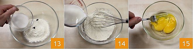 añade el azúcar 13 y comienza a mezclar con un batidor vertiendo la leche a hilo 14. En un cuenco aparte bate el huevo entero más la yema con un tenedor y añade una pizca de sal 15