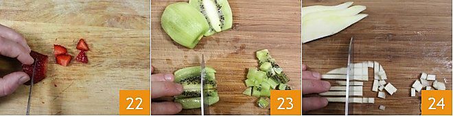 Ahora encárgate de cortar toda la fruta para el relleno en daditos pequeños y regulares (de aproximadamente 1 cm) y ponla a un lado: corta entonces las fresas 22, los kiwis 23 y la pera 24.