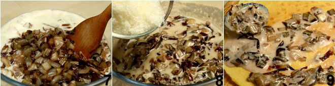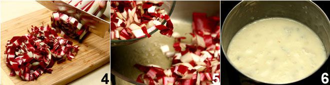 Continúa con la preparación del relleno cortando la achicoria trevigiana en tiras 4 después de haberla lavado cuidadosamente. Derrite 40 g de mantequilla en una cacerola, añade la achicoria 5, salpimenta y deja cocinar durante unos diez minutos con una tapa. Mientras tanto, en un cazo añade el gorgonzola y la leche 6, mezclando a fuego lento hasta obtener una crema.
