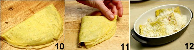 Pliega las crepes a la mitad 10 y luego en cuatro 11, colócalas en una fuente para horno 12. Espolvoréalas con el resto del Grana Padano y con 40 g de mantequilla derretida antes de hornearlas durante 10 minutos a 180° con modalidad grill. Sirve las crepes de gorgonzola y achicoria bien calientes.