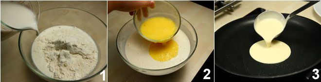 Para preparar las crepes de gorgonzola y achicoria, comienza preparando las crepes tamizando la harina en un bol y añadiendo una pizca de sal, la leche 1 y la mantequilla derretida, mezclando enérgicamente con un batidor para evitar la formación de grumos. Añade los dos huevos 2 previamente batidos, siempre mezclando, y deja reposar la masa en el frigorífico durante una hora. Pasado el tiempo de reposo, comienza a cocinar las crepes en una sartén antiadherente especial para crepes 3 (para conocer el procedimiento en detalle haz clic aquí).