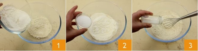Antes de empezar a preparar las crepes de harina de castañas con mascarpone y ganache de chocolate, aseguraos de derretir y luego dejar templar la mantequilla. Comenzad con la masa de las crepes: colocad la harina 00 y la de castaña tamizadas en un recipiente grande y de bordes altos 1, añadid el azúcar 2 y la pizca de sal 3.