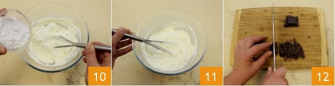 Luego añadid el azúcar glas tamizado, siempre mezclando 10. Una vez lista 11, cubrid la crema de mascarpone con papel film en contacto y ponedla en la nevera para que repose. Mientras tanto, preparad la ganache de chocolate: en un cazo calentad la nata fresca y mientras tanto cortad groseramente el chocolate negro con un cuchillo 12.