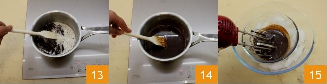 Tan pronto como la nata empiece a hervir, apagad el fuego y añadid el chocolate que habéis cortado. Mezclad con una cuchara de madera para integrar los ingredientes 13 y, cuando el chocolate se haya derretido completamente 14, dejad enfriar la ganache poniéndola al baño maría en un cuenco lleno de hielo; con una batidora eléctrica trabajad la ganache durante unos 10 minutos para que se vuelva cremosa, densa y brillante 15 y reservad.