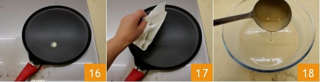 Pasado el tiempo necesario, poned a calentar una nuez de mantequilla en una sartén antiadherente de 26 cm de diámetro 16, extendiéndola por toda la superficie con un papel 17. Sacad la masa de las crepes del frigorífico 18.