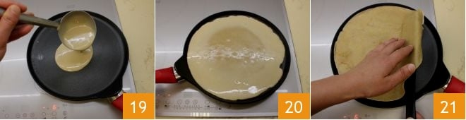 Y verted un cucharón de masa en el centro de la sartén 19, girándola para que se distribuya uniformemente por toda la superficie 20. Dejad cocer la crepe por un lado durante unos minutos y luego dadle la vuelta delicadamente con una espátula 21, cocinándola también por un minuto del otro lado.