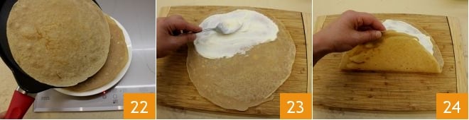 Transferid las crepes listas a un plato y apiladlas una sobre otra 22, repitiendo la operación hasta terminar la masa: con estas dosis obtendréis 8 crepes. En este punto, tomad una crepe y con una cuchara rellenadla hasta la mitad con la crema de mascarpone 23; cerradla en forma de media luna 24.