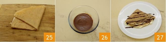 Y luego volved a doblarla por la mitad 25; presentad en un plato de servir y decorad al gusto con la ganache 26. Servid las crepes de harina de castañas con mascarpone y ganache de chocolate bien calientes 27.