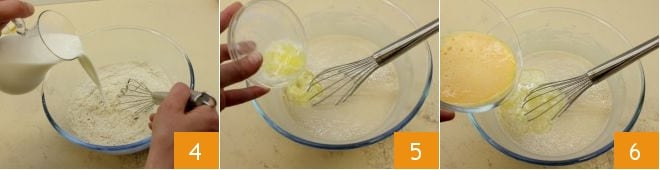 Verted la leche poco a poco, mezclando bien con el batidor para evitar la formación de grumos 4, luego añadid la mantequilla derretida y templada 5. En un cuenco aparte, batid los huevos y luego incorporadlos a la mezcla 6.