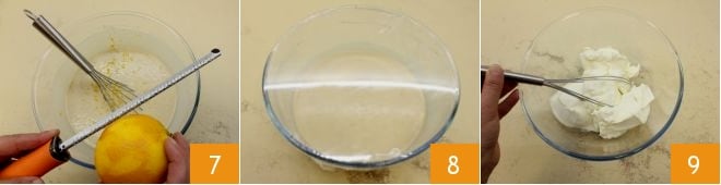 Añadid también la ralladura de naranja 7 y mezclad para integrar bien los ingredientes hasta obtener una masa lisa y homogénea; dejad reposar la masa en la nevera durante al menos 30 minutos, cubierta con papel film 8. Mientras tanto, preparad la crema de mascarpone: en un bol mezclad el mascarpone con el batidor para suavizarlo 9.