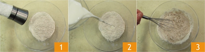 Para realizar las crepes integrales con verduras mixtas y feta, primero derrite la mantequilla para la masa y déjala templar. Vierte la harina integral y la sal en un bol 1, luego añade la leche poco a poco 2 mientras mezclas con un batidor 3.