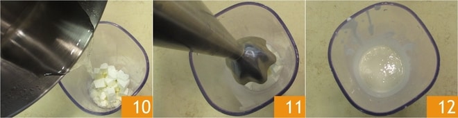 Transfiere la feta a un recipiente alto y estrecho, vierte el agua caliente 10 y bate con una batidora de mano 11 hasta obtener una salsa lisa y homogénea 12.