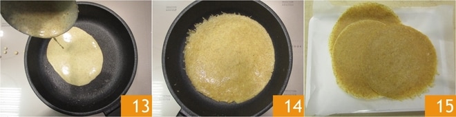 Retoma la masa del frigorífico y procede con la cocción de las crepes: pon al fuego una sartén antiadherente de 20 cm de diámetro y úntala con un poco de mantequilla, luego vierte en el centro un cucharón raso de masa 13. Cocina a fuego medio-bajo durante unos 3 minutos 14, luego dale la vuelta a la crepe y cocina un par de minutos también por el otro lado. A medida que se cocinen, apila las crepes en una bandeja 15; si no las usas inmediatamente, cúbrelas con film transparente o un paño para que no se sequen.
