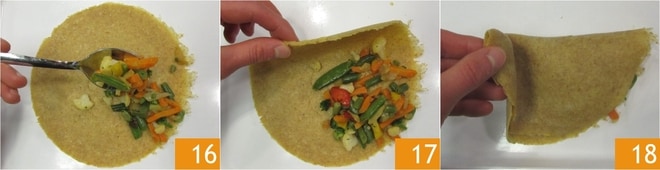 Estáis listos para componer las crepes: coloca el relleno en un cuarto de la superficie 16, luego dóblala por la mitad 17 y finalmente en triángulo 18. Procede de la misma manera para rellenar también las otras crepes.