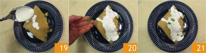 Decora las crepes con la salsa de feta 19, una pizca de pimienta y algunas hojitas de orégano fresco 20. ¡Vuestras crepes integrales con verduras mixtas y feta están listas para ser servidas 21!