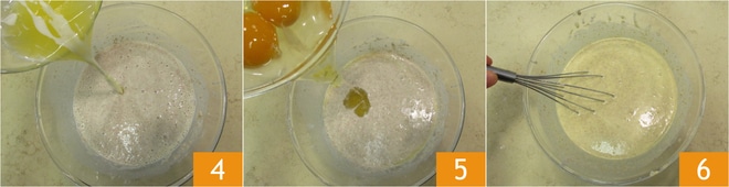 Añade también la mantequilla fundida templada 4 y los huevos 5 y mezcla de nuevo para amalgamar todo 6. Cubre el bol con film transparente y ponlo a reposar en el frigorífico durante 10 minutos.