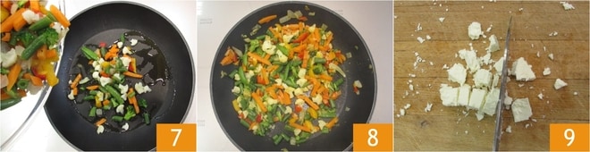 Mientras tanto, ocupaos del relleno: calienta una sartén antiadherente con un poco de aceite, añade las verduras 7 y saltéalas a fuego vivo durante 7 minutos 8, luego sala y deja templar. Ahora corta la feta en cubos 9 y calienta el agua hasta una temperatura de aproximadamente 70°.