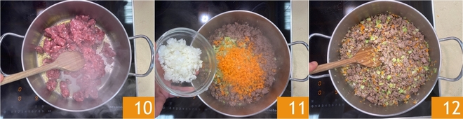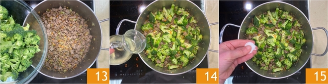 Dora la salchicha a fuego medio durante unos minutos, desmenuzándola más con una cuchara de madera 10. Cuando esté dorada, añade el tallo del brócoli y la mezcla del sofrito 11. Mezcla bien y deja que todo se ablande durante 5-6 minutos, hasta que las verduras estén suaves y perfumadas 12.