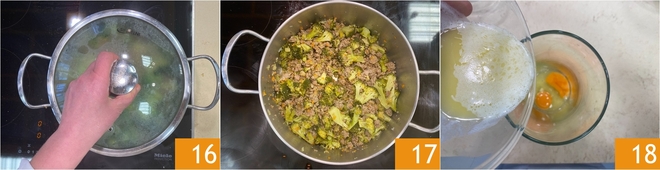 Cubre con una tapa 16 y cocina a fuego lento hasta que los brócolis estén tiernos pero aún consistentes 17. Mientras tanto, dedícate a la preparación de las crepes: derrite la mantequilla y déjala enfriar, luego viértela junto con los huevos en un recipiente alto y estrecho 18.