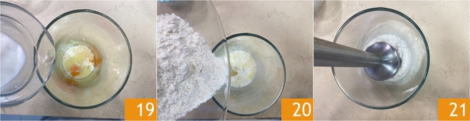Añade la leche 19 y finalmente la harina 20. Licúa todo 21 hasta obtener una masa lisa y sin grumos.