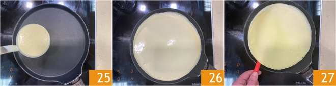 Calienta una sartén antiadherente de 24 cm. Vierte un cacillo escaso de masa en el centro 25 y gira la sartén para distribuir la mezcla de manera uniforme 26. Cocina la crepe durante unos 30 segundos de un lado, luego gírala con cuidado 27.